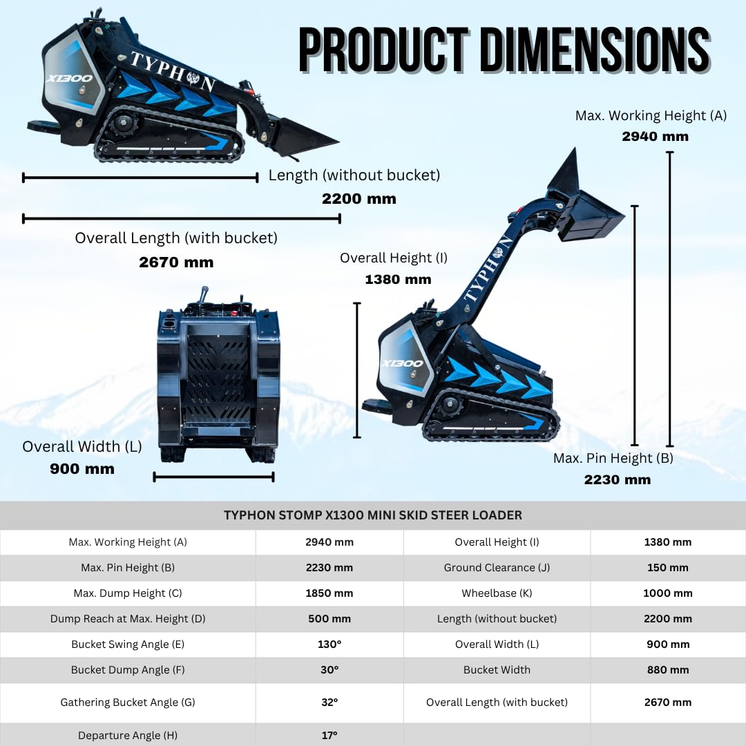 TYPHON Stomp X1300 Mini Skid Steer Loader, Diesel, 25HP Japanese D1105 EPA, 3040lbs Load Capacity