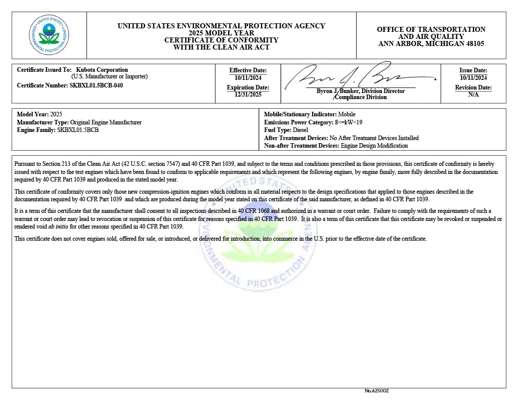 - Compact Yet Powerful: Features an EPA certified Japanese Kubota D1105 (25HP). for smooth functionality.A vertical, water cooled 4-cycle diesel engine, Kubota D1105 packs a power of 25 hp at 3000 RPM and 19 hp at 2200 RPM. It is a 3-cylinder, indirect injection diesel engine. The hydraulic system adopts an Italian HANSA closed-loop system. Withstands intensive construction projects without sacrificing performance.